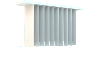 Constituído por um sistema de lâminas verticais com duas medidas, 127 e 89mm de largura, que por sua vez deslizam num mecanismo (calha) de alumínio extrudido e lacado, com 45mm de largura e 25mm de altura, através de transportadores em acetálico auto lubrificante, de acionamento e orientação manual por cordão ou totalmente elétrico.